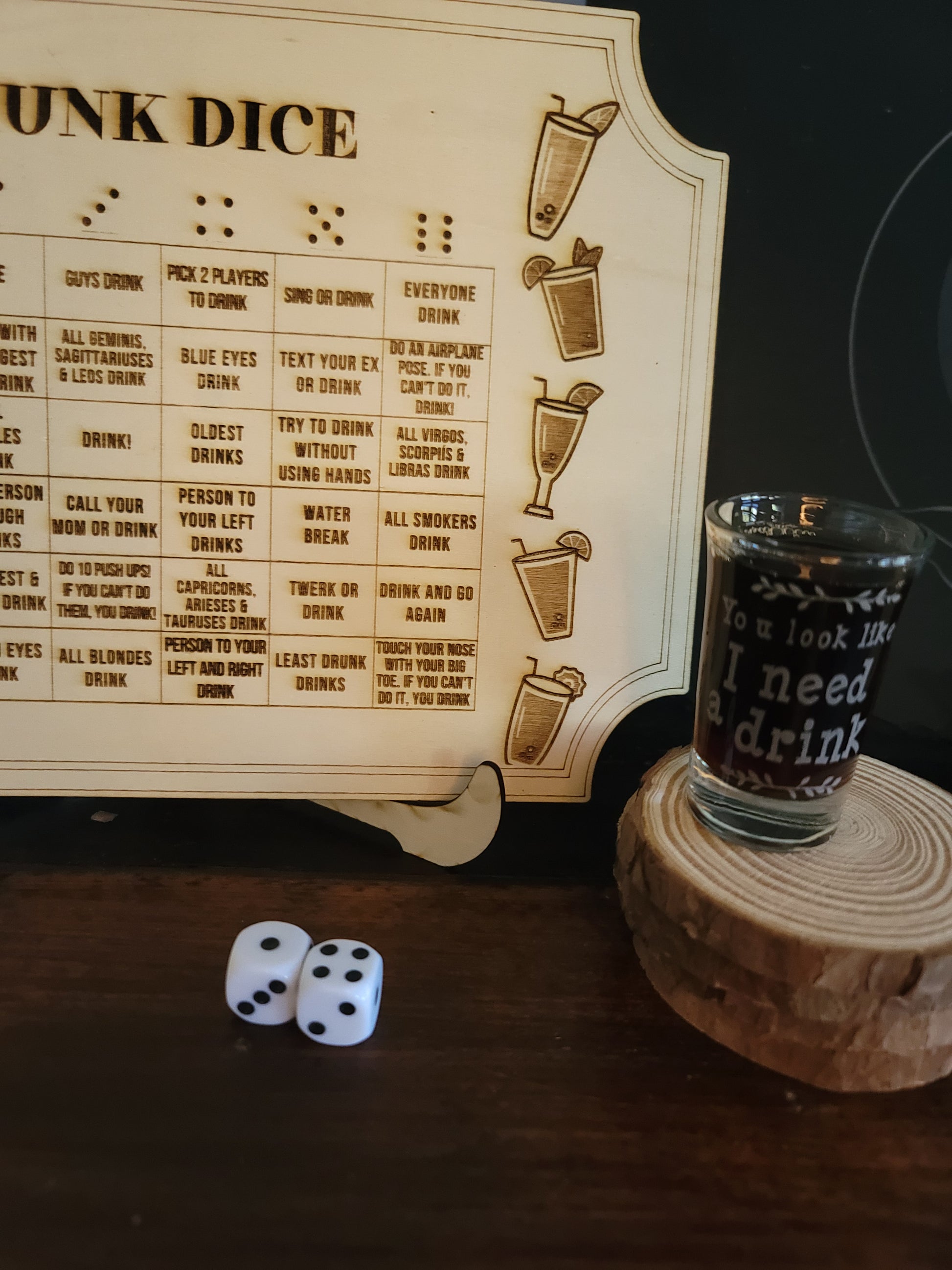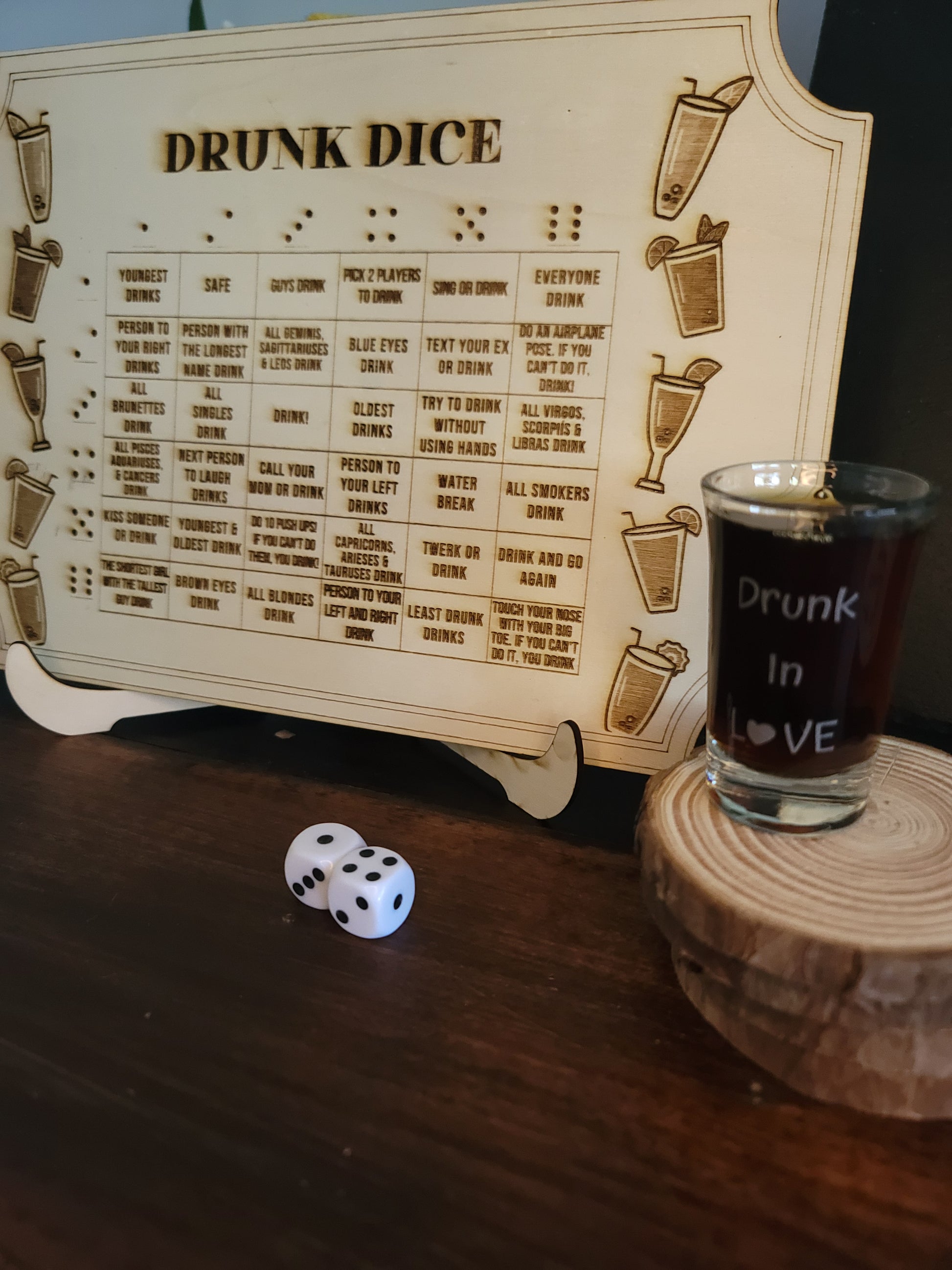 Comes with Board, 2 Dice and your choice of 2 or 4 shot glasses. Please email any personalization or design requests to craftedcharmllc@gmail.com